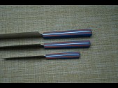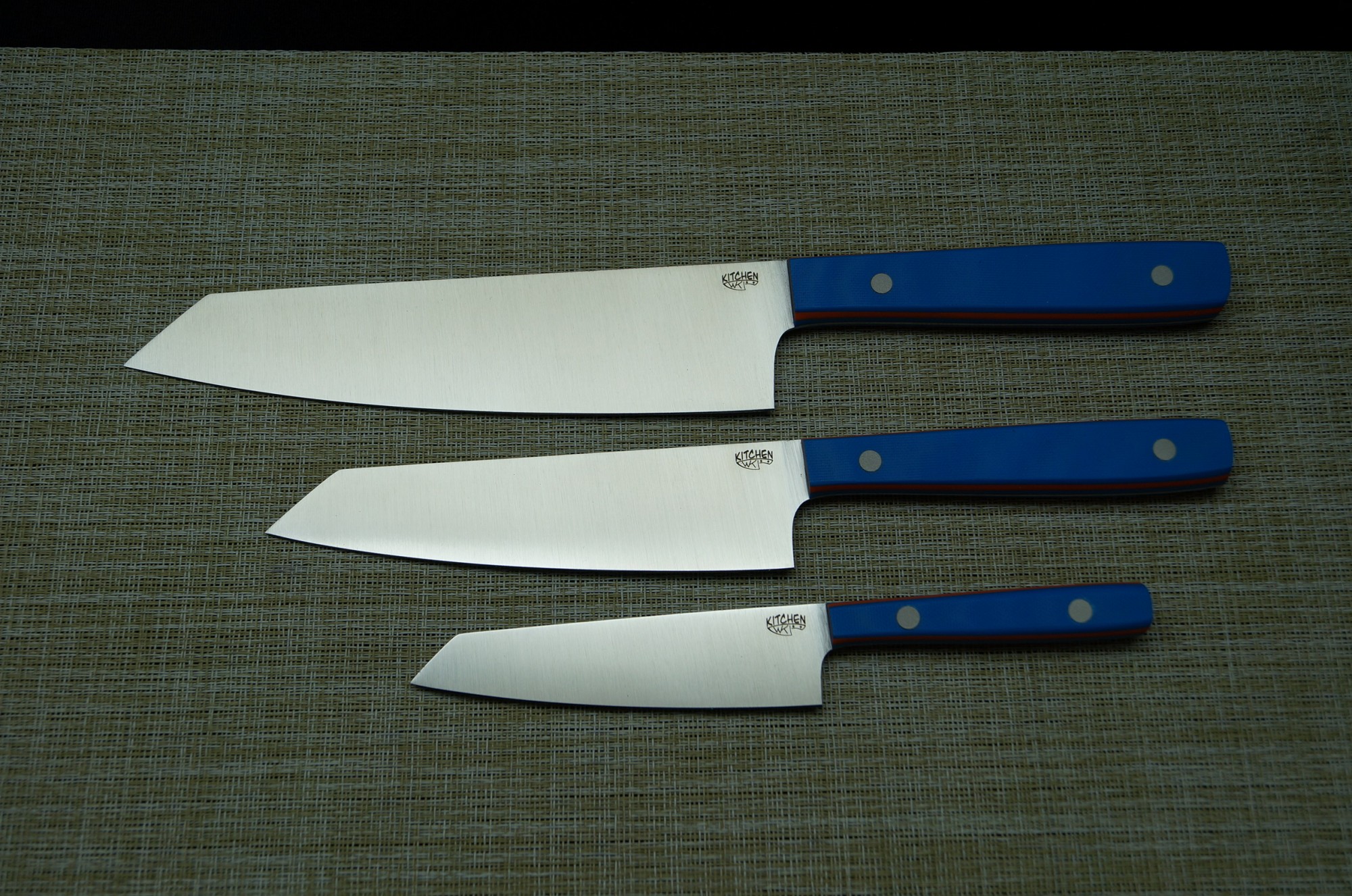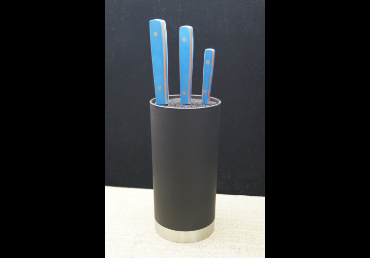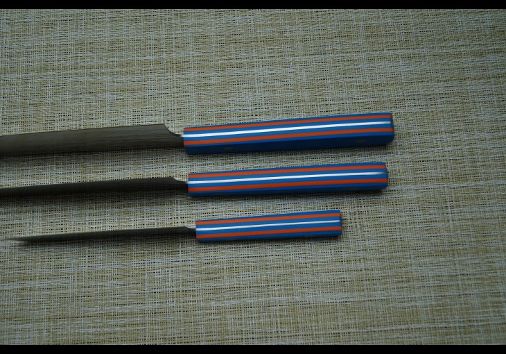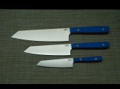 | Модификация: 290 | | Сталь: AUS8 | | Общая длина: 317-265-197мм. | | Длина клинка: 190-147-110мм. | | Ширина клинка: 46-37-27мм. | | Толщина клинка: 2,3-1,9-1,9мм. | | Покрытие: Сатин | | Рукоять: G-10(синяя и оранжевая-пескоструй) | | Ножны: Подставка |